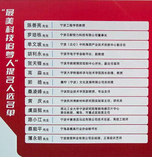 寻找宁波市“最美科技追梦人”活动,旨在通过层层发动,宣传推介一批在科技战线特别是科技基层一线涌现出来的贡献突出、事迹感人、体现时代精神风貌的科技工作先进典型,在我市科技战线掀起“推荐身边榜样、学习榜样事迹、践行榜样精神”的热潮,进一步弘扬“爱国、创新、求实、奉献、协同、育人”的科学家精神,不断激发科技工作者创新创业热情,为服务“两个先行”、奋力打造中国式现代化市域样板提供不竭的智力支撑。全市入选的36名科技工作者当中,有宁波大学、宁波工程学院、浙江万里学院、宁波职业技术学院等高校6名科技工作者入选。