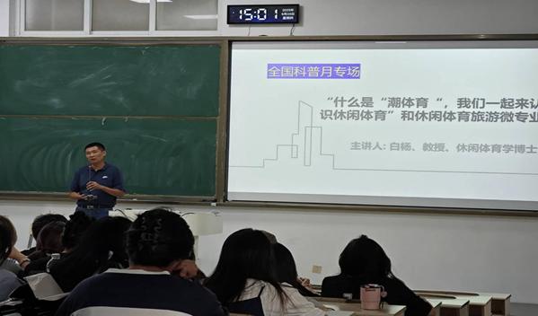 为精准对接2025年全国科普月的工作部署,主动扛起科研机构传播科学知识、服务社会大众的责任,同时帮助公众更深入地洞悉“商旅文体”融合浪潮下,休闲体育旅游这一新兴业态所蕴含的独特价值,9月25日,由我校科研处主办,休闲体育产业研究中心承办的以“商旅文体融合:休闲体育旅游的新业态密码” 为主题的休闲体育旅游科普专场活动,在东校区1307教室顺利开展。活动吸引全校100余名师生参与,旨在通过“理论解读+案例剖析+沉浸式体验”的多元化形式,让大家近距离感受休闲体育旅游串联商业、旅游、文化资源的独特魅力,树立“文体旅融合、乐享生活”的科学理念,读懂新业态背后的发展密码。